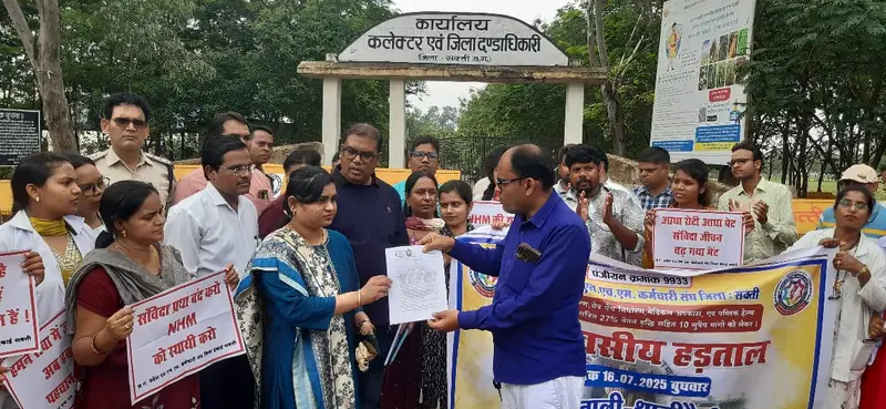एनएचएम जिला संघ सक्ती के कर्मचारियों ने अपनी विभिन्न मांगों को लेकर कलेक्ट्रेट मुख्यालय के बाहर जेठा में एक दिवसीय धरना प्रदर्शन किया। इस दौरान एनएचएम संघ जिला सक्ती के पदाधिकारियों के अगवाई पे जिले भर से पहुंचे कर्मचारियों ने धरना प्रदर्शन में भाग लिया। एनएचएम संघ के सभी कर्मचारियों ने धरना प्रदर्शन पश्चात शांति पूर्वक रैली निकालकर कलेक्ट्रेट पहुंचे जहां उन्होंने प्रशासन को ज्ञापन भी सौंपा। विदित हो कि एनएचएम जिला संघ अपने प्रदेश नेतृत्व छत्तीसगढ़ एनएचएम कर्मचारी संघ के आह्वान पर एकदिवसीय धरना प्रदर्शन बुलाया था । जिसमें उन्होंने अपनी संविलयन व स्थायीकरण, पब्लिक हेल्थ केयर की स्थापना, ग्रेड पे निर्धारण, कार्य मूल्यांकन व्यवस्था में पारदर्शिता, लंबित 27% वेतन वृद्धि, अनुकंपा नियुक्ति, स्थानांतरण नीति, मेडिकल एवं अवकाश सुविधा सहित अपनी दस सूत्रीय मांगों को पूरा किए जाने की बात कही है। इस संबंध में जिला एनएचएम जिला संघ सक्ती के पदाधिकारियों ने मीडिया को बताया कि छत्तीसगढ़ प्रदेश में राष्ट्रीय स्वास्थ्य मिशन अंतर्गत लगभग 16000 कर्मचारी कार्य कर रहे हैं जिसमें चिकित्सकीय एवं प्रबंधकीय दोनों ही प्रकार की कैडर मिलकर प्रदेश के स्वास्थ्य सेवाओं को सुचारू रूप से संपादित कर रहे हैं। कॉविड कॉल में विषम परिस्थितियों में भी अपनी सेवाएं दिए जिसमें कई कर्मचारियों को जान तक गवानी पड़ी है। संघ के कर्मचारियों ने आगे बताया कि हम सभी राष्ट्रीय स्वास्थ्य मिशन के कर्मचारी वर्ष 2018 में निर्मित मानव संसाधन नीति के दिशा निर्देशों के तहत कार्य करते हैं समय के साथ-साथ कर्मचारियों की समस्याओं में इजाफा होता जा रहा है। संघ के पदाधिकारियों ने प्रशासन से मांग की है कि सामाजिक आर्थिक सुरक्षा का ध्यान रखते हुए अस्पतालों में कार्यरत एचडब्ल्यू सी संगवारी की सेवा निरंतर करते हुए पद को आरओपी में स्वीकृत किए जाने की बात कही है।