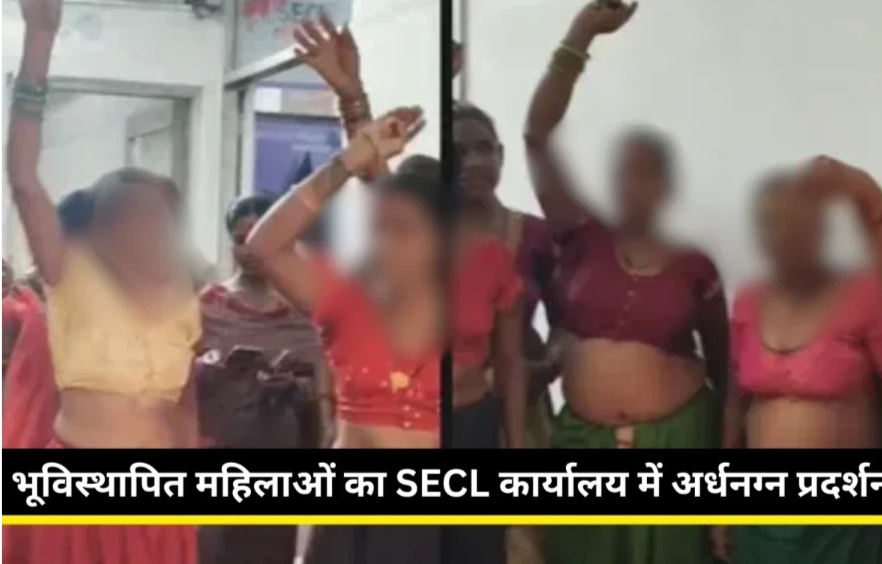 कोरबा : कोरबा जिले में SECL की कुसमुंडा परियोजना के कार्यालय में भूविस्थापित परिवारों की महिलाओं ने अर्धनग्न होकर प्रदर्शन किया। रोजगार और मुआवजे की मांग को लेकर यह पहला मौका है जब महिलाओं ने इस तरह प्रदर्शन किया। GM कार्यालय में SECL प्रबंधन पर वादाखिलाफी का आरोप लगाया।