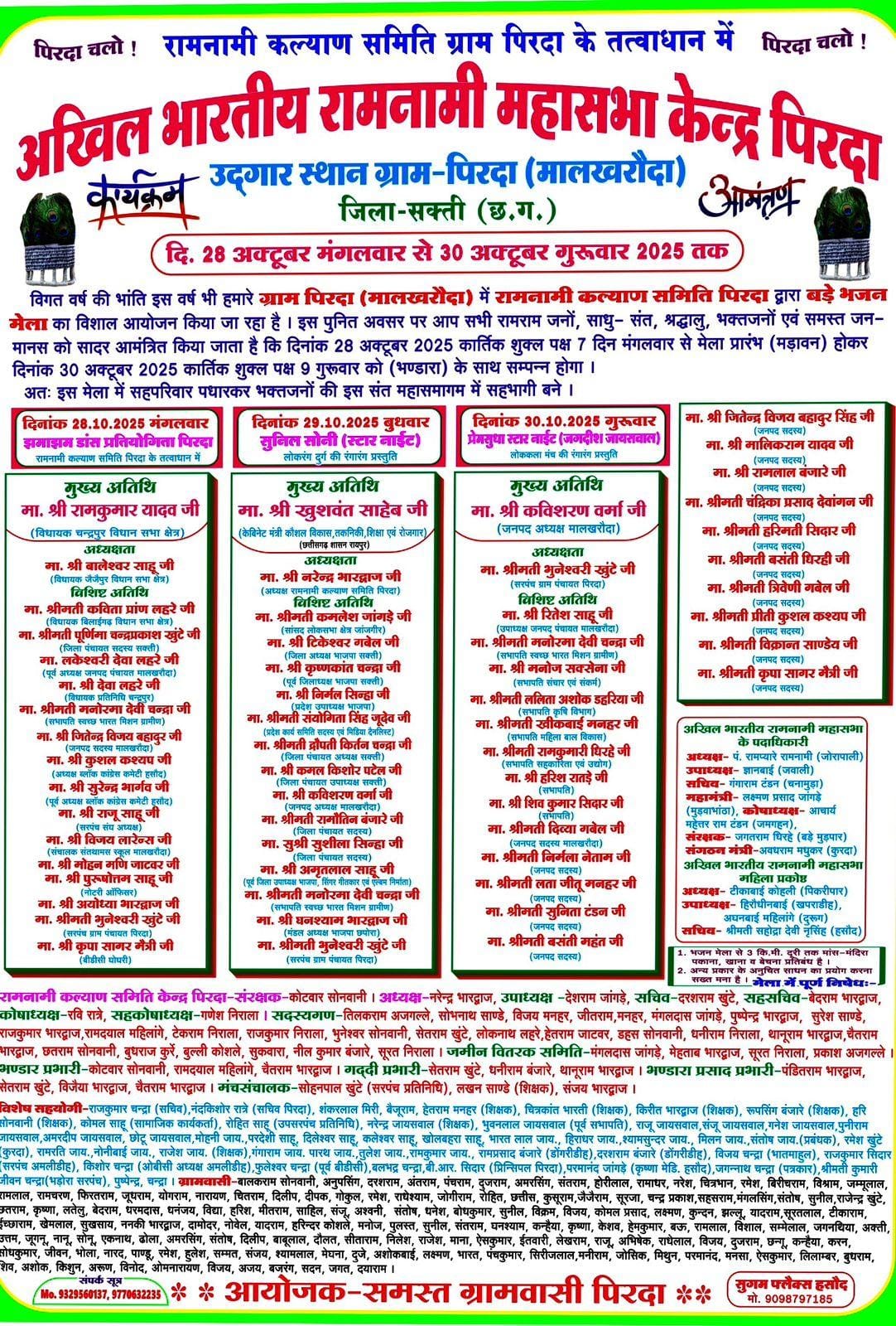 मालखरौदा । सक्ती जिले के मालखरौदा जनपद पंचायत अंतर्गत आने वाले ग्राम पंचायत पिरदा में इस बार फिर रामनामी भजन मेला का आयोजन किया गया है जिससे बडे भजन मेला का आयोजन होता है। मेला की शुरूआत ग्राम पिरदा में वर्ष 1911 में हुआ था जिसके बाद 2009 में हुआ , तब से लगातार राम राम भक्तों द्वारा इसका आयोजन कर मेला लगाया जा रहा है इस बार 28 /10/2025 में आयोजन किया गया है जिसमें कैबिनेट मंत्री गुरु कुशवंत साहब भी भजन मेला के दूसरे दिन शामिल होंगे जिसकी तैयारी पूरी हो चुकी है रामनामी भजन मेला में बडी संख्या में भक्त जन पहुंचकर जैतखाम की पूजा करते हैं और अपनी मनोकामना पूर्ण करने के लिए उनसे प्रार्थना करते हैं। इस अवसर पर रामनामी समाज के भक्तजन आज भी रामनामी समाज के लोगों ने रामनाम लिखे वस्त्र पहनकर व मोर पंख मुकुट धारण कर जयस्तंभ की परिक्रमा की और ध्वजारोहण किया जाता है । रामनामी कल्याण समिति केन्द्र पिरदा