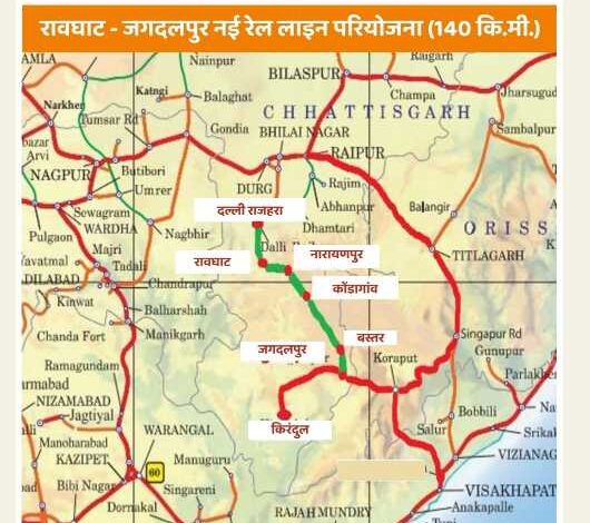 भारत सरकार के रेल मंत्रालय ने रावघाट-जगदलपुर नई रेल लाइन (140 किमी) परियोजना को स्वीकृति प्रदान कर दी है। इस परियोजना पर 3513.11nm करोड़ रुपए की लागत आएगी, जिसका वहन केन्द्रीय बजट से किया जाएगा। यह निर्णय बस्तर अंचल के सामाजिक, आर्थिक और औद्योगिक विकास में मील का पत्थर साबित होगा।